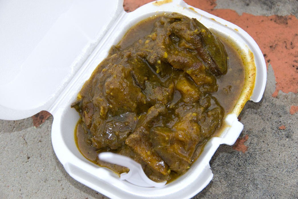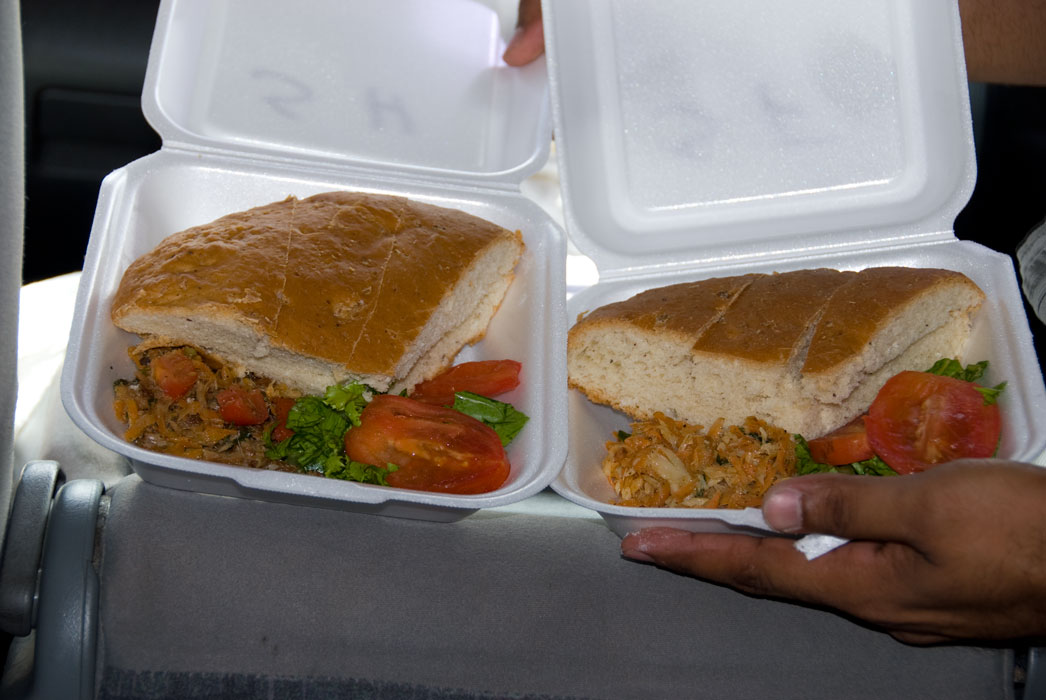 Jesse unwraps the roti and buss-up shot skins that will be used with the six fillings he has purchased