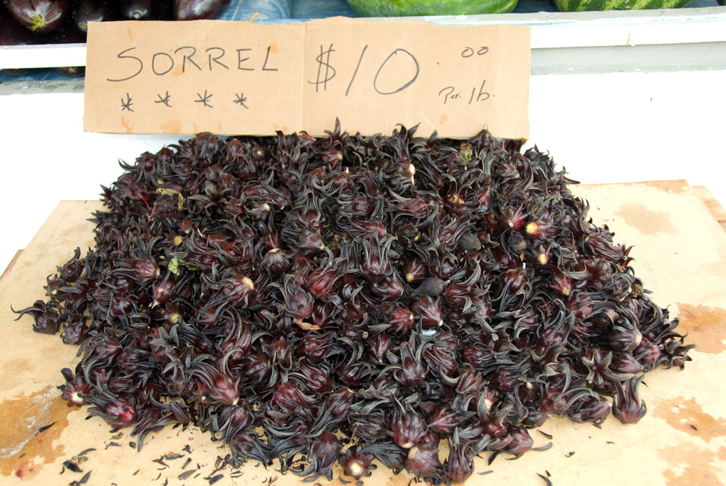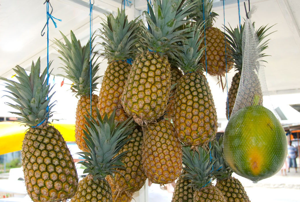 Adjacent to the doubles stand, a fruit and vegetable stand, with papaya ...