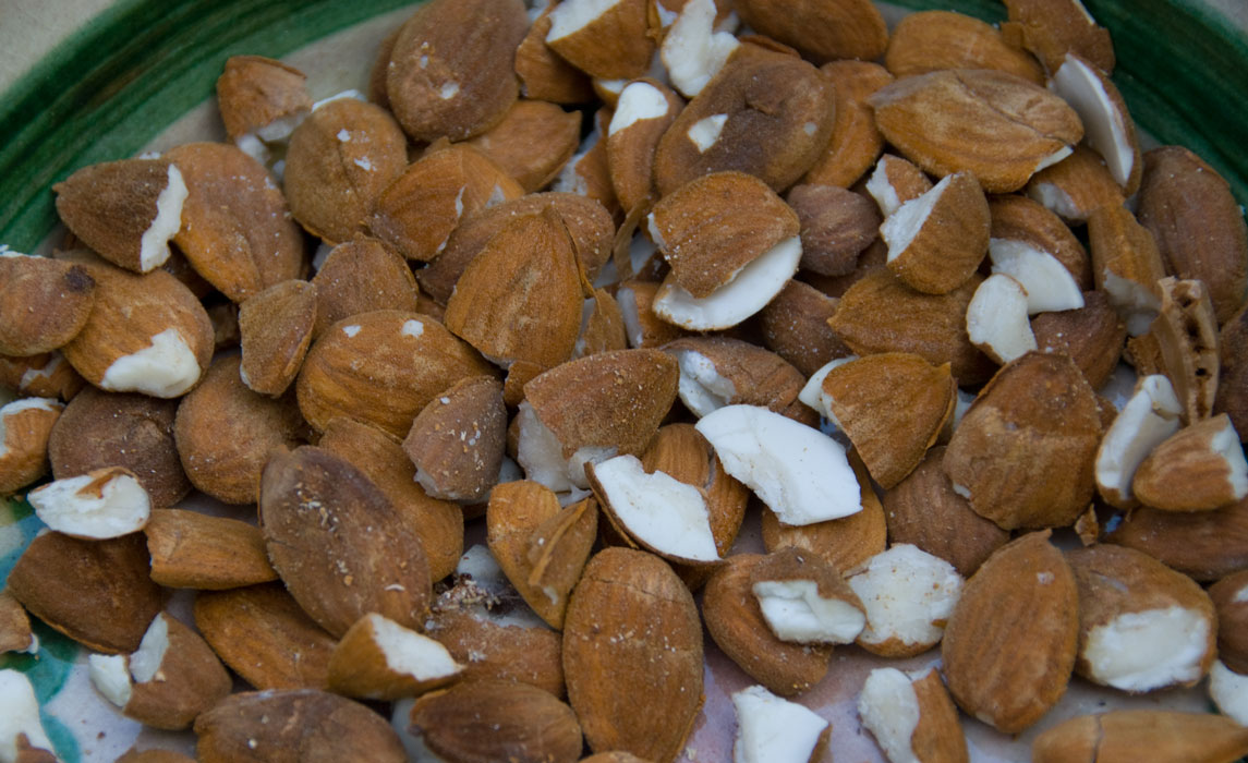 onto the tarp. Some of the almonds still were encased in an outer pod,