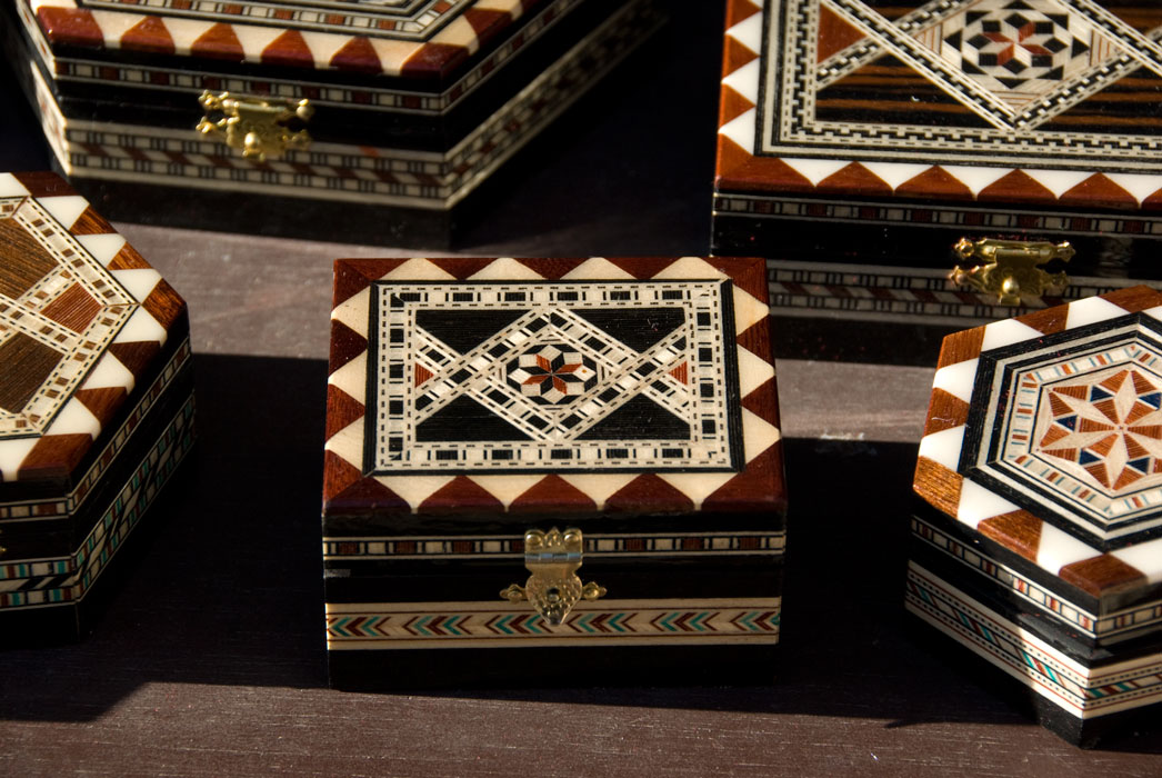 Intricately-inlaid boxes were for sale in many of the small shops along the street