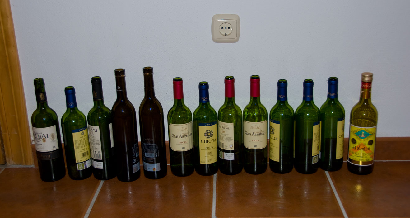 By the evening immediately before the official start of the party, everyone had arrived. We all gathered at Casa Emilia for the typically-late* evening meal, and in the course of the evening managed to consume 13 bottles of wine. (See photo below.)