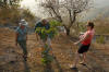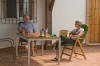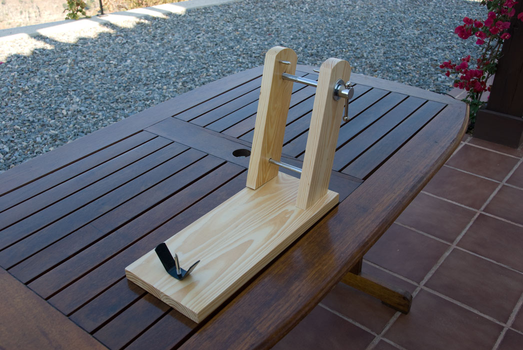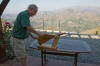 In the early days after our arrival, we were all busy preparing for the party. Lars Helge and I trimmed his three palm trees. Barb and Lars Helge washed the dust off the front gate and the railing around the rear patio. Lars Helge vacuumed the pool, and washed the rim. After Tove arrived we visited a nursery and picked up some flowers to refresh the beds around the pool. We had several grocery-shopping expeditions, on one of which we bought a Serrano ham and a stand on which to carve it. On the day after Tove arrived, Barb and I took the rental car back to Malaga and picked up Barb's good friends Monica and Lynne who arrived from America. Later that day, Rasmus and Kari arrived, driving their own car. They had been vacationing in France and Spain and were also delivering a special machine designed to crack the shells of almonds. More about that later.
