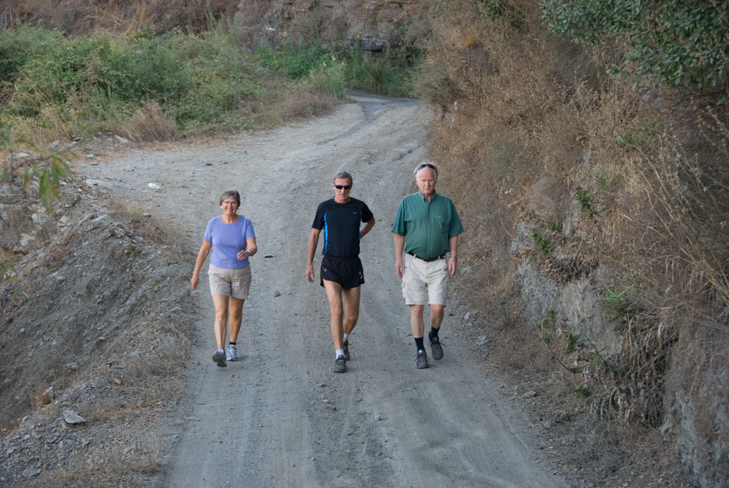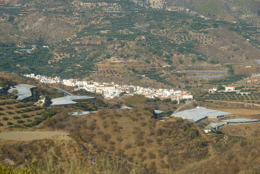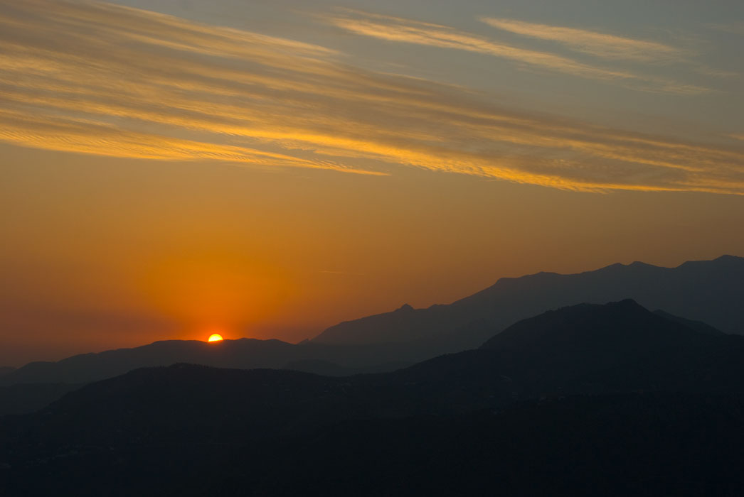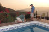 We flew in to Malaga, Spain from Las Vegas via Minneapolis and Paris, arriving after spending 22 hours in airports and airplanes. Lars Helge was there to meet us, and transported us and our excessive luggage the 100 kilometers to the east to his villa, Casa Emilie, near the tiny village of Itrabo. Tove would arrive the next day, so it was just the three of us. Barb and I had a long nap, and then awoke to enjoy the quiet end of day on the side of the mountain. There was no wind. No insects. Absolutely no sound. None. One doesn't realize how much noise one lives in until it is absent. Totally absent. Eerie. Presumably, whatever "normal" noises that were generated by the surroundings were absorbed by the huge valley that lies immediately to the west of our villa. Here is a panorama of that immense valley, taken from our patio, and a sunset picture in the same direction (of course):