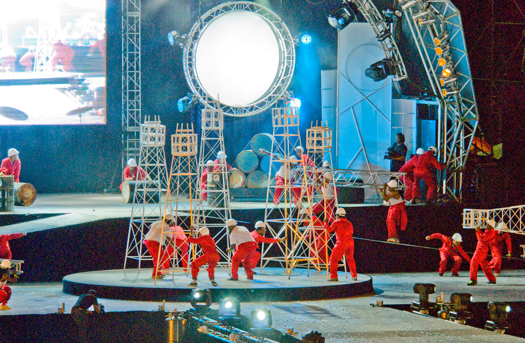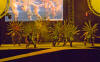 stadium, and a stage has been erected at the far end. The pan band is in the