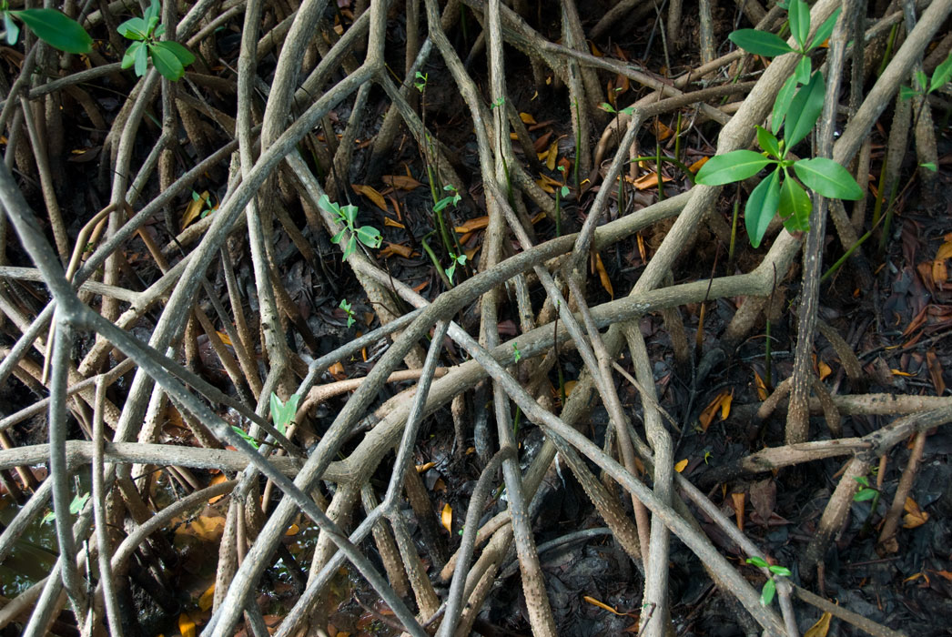 Salt flat with white mangrove shoots (used for "breathing", since the leaves are caked with expelled salt
