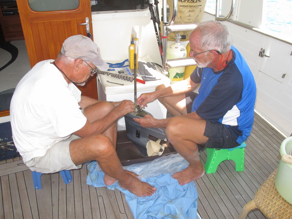 Ken (Silverheels III) and Chuck replacing impeller on our dinghy