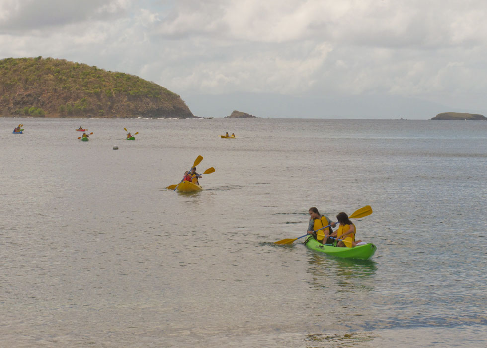 Kayakers arriving at the beach, where a concession on a trailer was parked