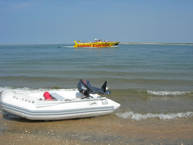 Jo and I made it back to the boats in time to greet the guys when they came back from the dive. They took us out to a great restaurant that night. The next day we headed out to Cape Lookout to spend a few days. Cape Lookout is the barrier island off the coast of Beaufort / Morehead City. It reminds me a lot of Cumberland Island in Georgia but much narrower and not covered with live oaks. The island is still pristine and protected by the national park service. It has a lot of shoreline with a sandy beach on all sides of it, so lots of boats and people can use the island and still feel like they have the island to themselves. The fabulous anchorage area is called Lookout Bight as it has a protective arm and elbow on the north western side that protects vessels from all winds except from the north or northeast. It was a wonderful place to spend a few days. We were far from the lights of the mainland, it was almost new moon and the sky was clear, so we saw the Milky Way as clearly as I've ever seen it and more stars than I can ever remember. We had a great evening laying out watching the stars.